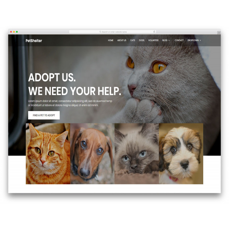 Наряду с главной страницей существуют информационные страницы о питомцах, волонтерах, блог сообщества. Есть выпадающее меню, шаблон поддерживает рекламные ролики и поставляется с слайдером отзывов. Создайте сайт и привлекайте людей, которые любят домашних животных и готовы помогать им материально и духовно.